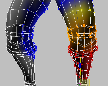 Em geral, o que foi feito foi pesar os vértices na metade inferior do joelho principalmente até a panturrilha e iniciar metade até o joelho, dando mais peso à coxa gradualmente. Alguns ajustes manuais foram necessários para acomodar os vértices de “fendas” na parte de trás do joelho.