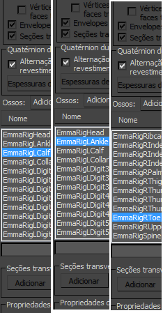 - Selecione cada um dos ossos do pé, um de cada vez: EmmaRigLCalf, EmmaRigLAnkle e EmmaRigLToe.