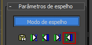 Para fazer o espelhamento real, são usados os cinco botões abaixo do botão Modo de espelho. Da esquerda para a direita, eles espelham somente os vértices selecionados, todos os ossos de um lado para outro e todos os vértices de um lado para outro. Para este tutorial, será usado Colar vértices azuis em verdes, o botão marcado em vermelho na seguinte ilustração: