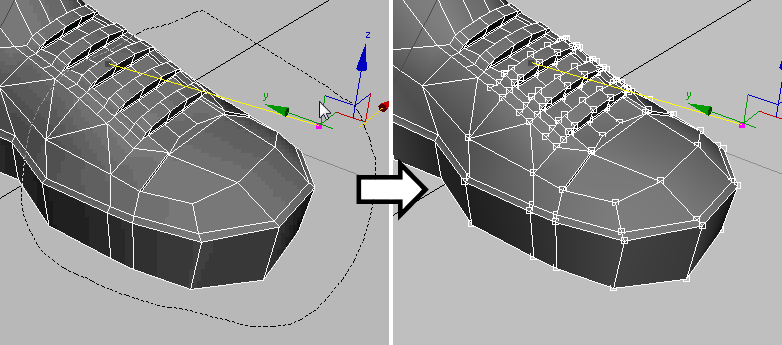 - A seguir, olhando para a parte inferior do pé, talvez você observe uma lacuna bastante ampla entre o conjunto de vértices na dobra e aqueles imediatamente atrás dela. Novamente, selecione os vértices inadequados e aumente o valor do controle giratório Efeito absoluto gradualmente até que o sapato pareça mais realista.