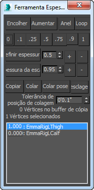 A lista mostra as atribuições de osso do vértice selecionado e o valor de Peso para cada atribuição. Observe que os valores de Peso sempre somam 1.0. Por exemplo, se você alterar o valor de Peso de um determinado osso para um vértice que seja influenciado por três ossos diferentes, o 3ds Max alterará os valores para os outros dois ossos na direção oposta, proporcionalmente aos seus valores atuais.