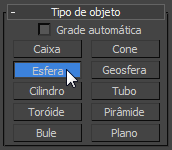 (Geometria), depois, na implementação do Tipo de objeto, clique para ativar Esfera. O botão é realçado para mostrar que está ativo e pronto para utilizar.