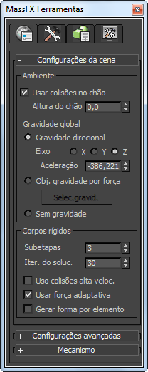(Parâmetros universais). 3ds Max abre a caixa de diálogo Ferramentas de MassFX para o Painel de parâmetros universais.