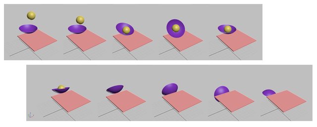 (Iniciar simulação). Há uma breve pausa, enquanto o 3ds Max faz os cálculos, a seguir, a bola cai na tigela, balança um pouco, e termina rolando para fora da mesa, levando a tigela com ela.