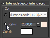 - Sobre a intensidade / Cor/Atenuação da lista suspensa, escolha a opção Kelvin (temperatura de cor) para alterar a cor da luz para amarelo suave (2800K).