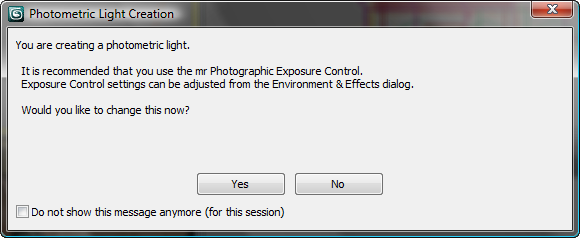 3ds Max Abre uma caixa de diálogo que pergunta se deseja adicionar um “Controle de Exposição fotográfica” à imagem.