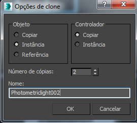 3ds Max Abre uma caixa de diálogo de opções de duplicação. Na caixa de diálogo