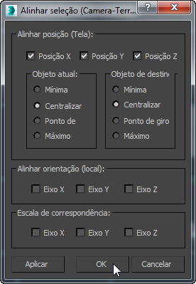 Seleção de Alinhamento (tela) do grupo, ative as posições de X, Y e Z e em seguida, selecione o centro do objeto atual e o objeto de destino. Clique em OK.
