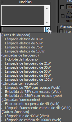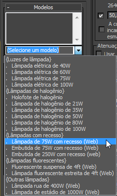 3ds Max atualiza os valores nas implementações abaixo da implementação de modelos para combinar com as propriedades reais de uma luz incandescente de 75W com distribuição não uniforme (web). É possível ajustar essas propriedades, mas para a presente imagem, utilizaremos os valores do modelo.