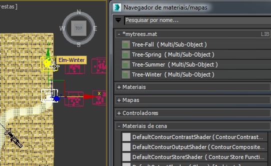 - Na janela viewport superior, clique e Ctrl+ clique para selecionar Elm-Winter e Oak-Winter e a seguir arraste o Tree-Winter Material a partir do Navegador Material/Map