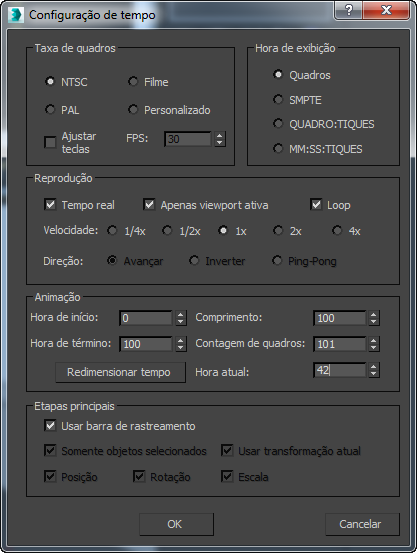 (Configuração de tempo). O 3ds Max abre a caixa de diálogo de configuração.
