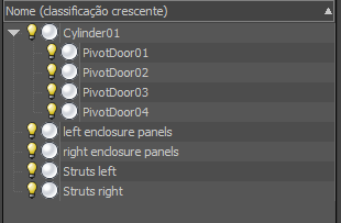 Quando você executar as etapas anteriores, a hierarquia no painel Explorer da cena será atualizada para mostrar que a partir de agora as portas são elementos secundários do Cilindro01. Ao terminar, a lista de objetos deverá ter este aspecto: