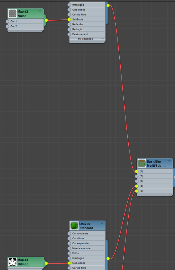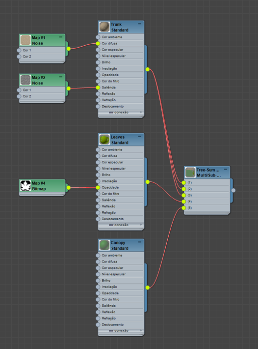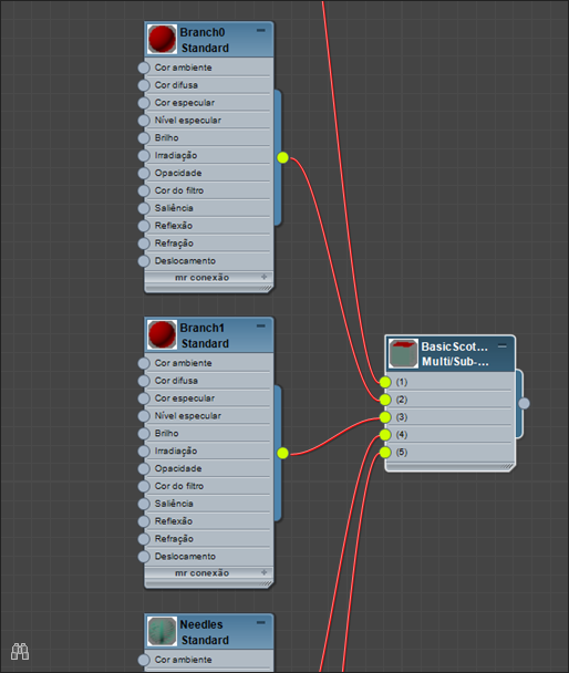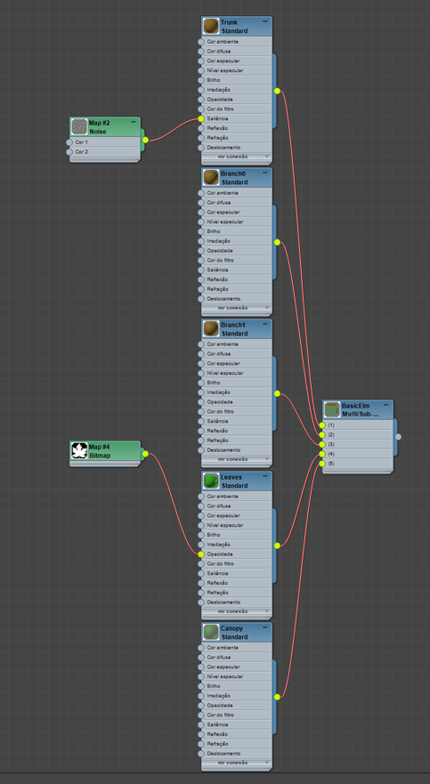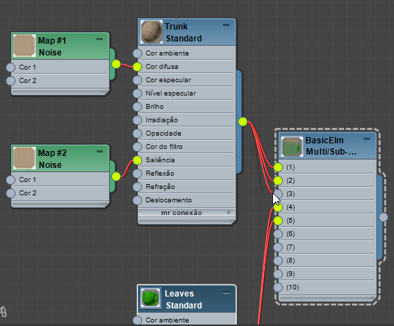 - Ligue o nó do submaterial Tronco aos soquetes principais (2) e (3) do submaterial OlmoBásico que contém os submateriais Ramo0 e Ramo1.
