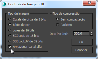 3ds Max abre a caixa de diálogo Controle de Imagem TIF. No grupo Tipo de imagem, assegure que Cor em 8 bits está selecionado e que Armazenar canal alfa está ativo.