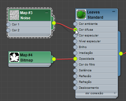 - Arraste outro Mapa de ruído do Navegador para a Vista ativa e ligue o nó do Mapa de ruído ao soquete Cor difusa do submaterial Folhas.