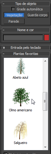 Nota: Além dos objetos de árvore disponíveis no 3ds Max, há uma série de plug-ins disponíveis comercialmente, como o Forest da Itoo Software ou o RPC da ArchVision, que oferecem uma ampla gama de espécies de árvore alternativas.