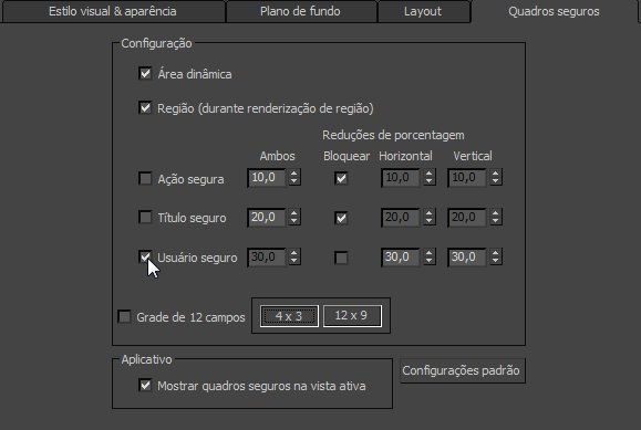 - Clique na etiqueta da viewport Ponto de vista (POV) e selecione Mostrar enquadramento seguro. Altere o modo sombreado da viewport para Realista (pressione F3).