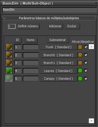 A implementação de parâmetros básicos do multi/subobjeto mostra como o material OlmoBásico contém cinco submateriais atribuídos separadamente ao tronco, ramos e folhas.
