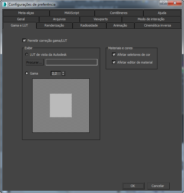 - 3ds Max abre a caixa de diálogo Preferências na aba Gama e LUT. Verifique se Ativar correção de gama/LUT está ativado, se Gama está selecionado e se o valor gama está definido como 2,2.