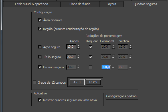 O quadro seguro é exibido como um quadrado amarelo indicando a extensão da área de renderização.