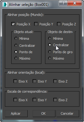 grupo Alinhar posição (Universal), ative as posições X, Y e Z. Nos grupos Objeto atual e Objeto de destino, selecione Centralizar e clique em OK.