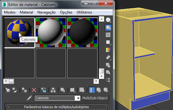 As faces frontais do armário mudam de cor. A elas é atribuído um número de ID de material diferente do restante do armário e, dessa forma, recebem um submaterial diferente.