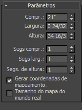 painel Modificar e na implementação Parâmetros, defina Comprimento como 21,0Largura como 0,75 e Altura como 34,5. Assim que você digitar os valores, eles serão convertidos em polegadas e frações de 1/32 polegadas, com base na configuração de unidade especificada no arquivo de cena.
