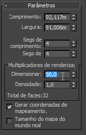 Isso multiplica a superfície do plano em um fator de 50 cada vez que a cena é renderizada. Usar o fator de escala pode ser mais conveniente do que atribuir ao plano grandes dimensões.