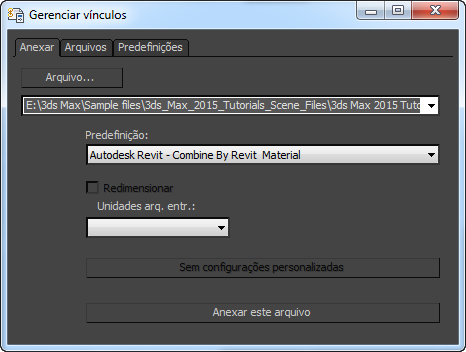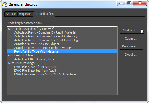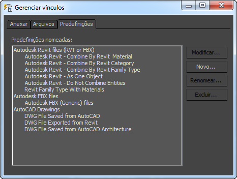A guia Predefinições lista várias predefinições para vincular arquivos RVT, FBX ou DWG. Na guia Anexar principal, é possível selecionar uma predefinição na lista suspensa Predefinição. Utilize a guia Predefinições para editar valores predefinidos ou adicionar um novo.