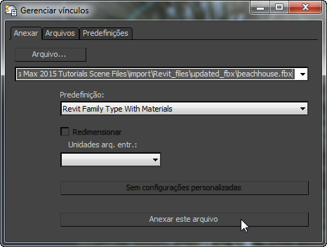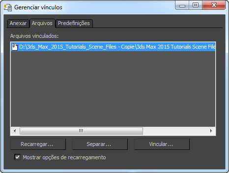 está vinculado à cena do 3ds Max. Você usará essa guia novamente após efetuar as alterações na cena no Revit; por enquanto, você concluiu a tarefa no Gerenciador de links de arquivo.