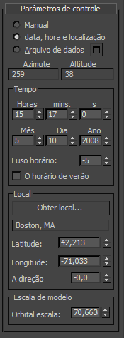 Painel de movimento. Na implementação Parâmetros de controle, observe as configurações. A localização está devidamente configurada como Boston e os campos