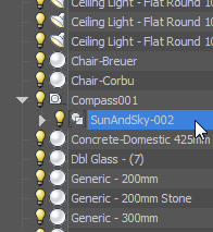 SunAndSky-002 é filho de Compass001. Se inicialmente você não vir SunAndSky-002, clique no ícone de seta próximo de Compass001 para ver SunAndSky-002. Além disso, você pode precisar aumentar a largura da coluna Nome para ver os nomes dos objetos.