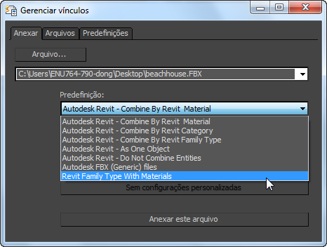 - Volte ao painel Anexar e escolha Tipo de família do Revit com materiais na lista suspensa Predefinição.