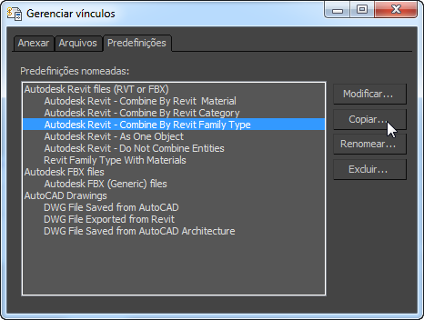 - Na guia Predefinições, clique para realçar a entrada Autodesk Revit - Combinar por tipo de família do Revit e clique em Copiar.