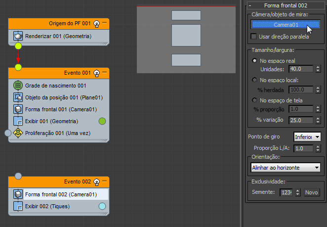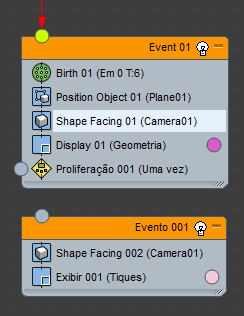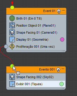 Com essa conexão, Evento 001 gera um conjunto de partículas uma vez e ase envia para Evento 002, onde são instruídas para ficarem voltadas para o sol.
