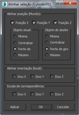 grupo Alinhar posição (Mundo), ative a posição X, Y e Z. Selecione o Ponto de giro para o Objeto atual e o Objeto de destino. Clique em OK.