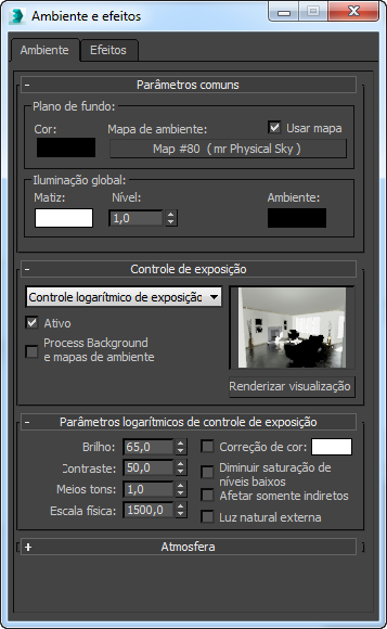 Ambiente de renderização. O 3ds Max abre a caixa de diálogo Ambiente e efeitos.