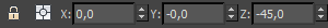 (Selecionar e Girar) e, então, mova o mouse sobre tripé de meta-alça Transformação na janela de visualização. Quando o eixo Z (círculo azul horizontal) for ressaltado, clique e arraste para girar o objeto de painéis de cercamento direito dem 45 graus em torno do eixo Z até que toca o objeto de painéis de cercamento esquerdo objeto, como mostrado abaixo. À medida que rotaciona, você pode ver a quantidade de rotação em texto amarelo na janela de visualização, bem acima da meta-alça transformação. Para obter o resultado desejado, ele deve ler (0,00, 0,00, 45,00).