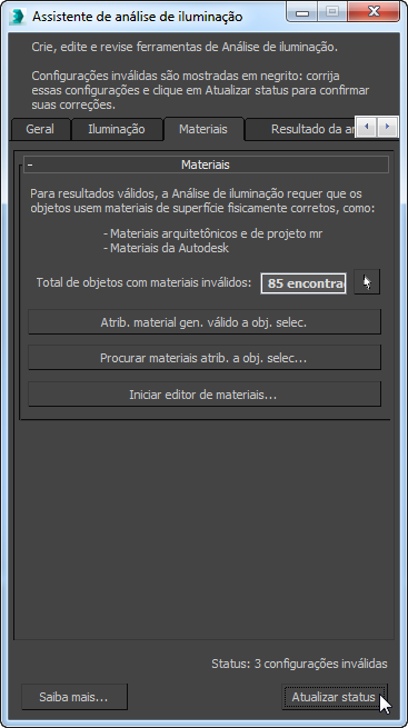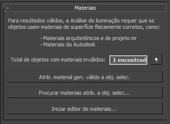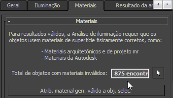 A ferramenta de análise de iluminação requer que todos os objetos na cena utilize fisicamente corretas materiais de superfície. Somente objetos atribuídos a mental ray ARCH e projeto de material ou um dos materiais da Autodesk (incluindo os materiais da biblioteca de materiais da Autodesk) são permitidos. Todos os outros materiais são considerados inválido. Objetos com nenhum material atribuído também são tratados como inválido.