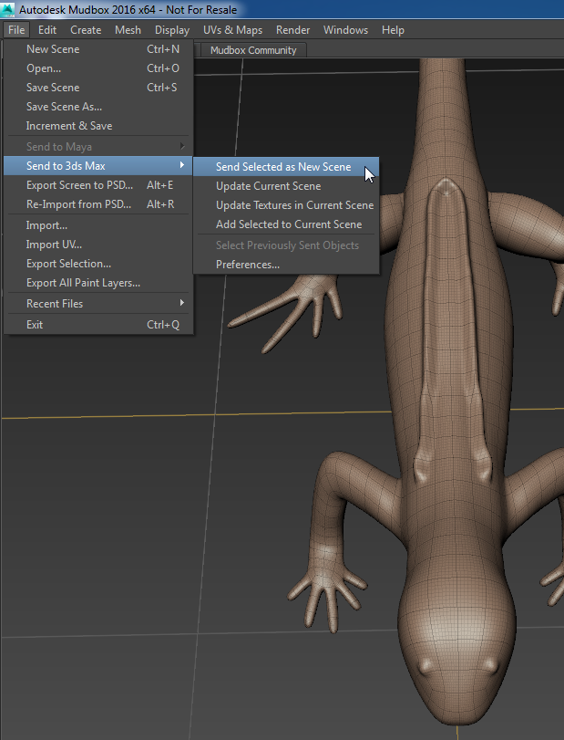 O Mudbox inicia o 3ds Max. Após uma pausa, o modelo do lagarto aparece nas viewports. Ele já está selecionado.