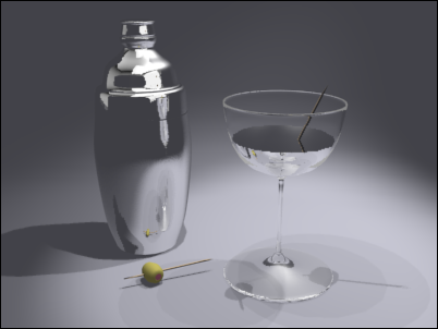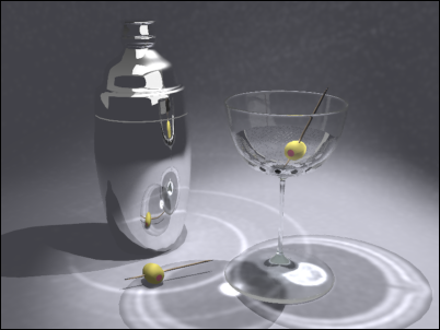 A segunda renderização, feita com o agente de renderização mental ray, mostra cáusticos projetados por refração através do vidro de Martini. Cáusticos também são visíveis na reflexão da coqueteleira.