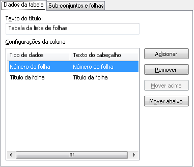 Exibe uma lista de definições de coluna na tabela de lista de folhas. Cada linha na lista representa uma coluna. A classificação de cima para baixo da lista representa como as colunas serão exibidas na tabela (da esquerda para a direita).