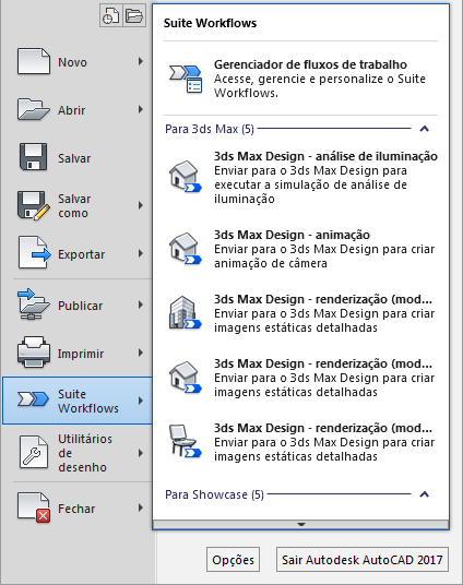 Caso tenha o AutoCAD Suite, você poderá utilizar fluxos de trabalho predefinidos ou personalizados no AutoCAD para gerar modelos no Autodesk 3ds Max ou Autodesk Showcase.
