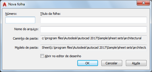 Especifica o nome do novo arquivo de desenho contendo a folha. Por padrão, o nome do arquivo de desenho é o número da folha combinado com o título da folha. O nome do arquivo de desenho também pode ser alterado nesta caixa.