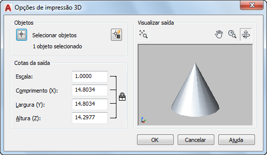 A caixa de diálogo Opções de impressão 3D é exibida quando você usa os comandos IMPRESSAO3D ou SERVIÇOIMPRESSÃO3D. É possível visualizar e modificar o tamanho ou especificar a escala de saída sem afetar as proporções gerais.