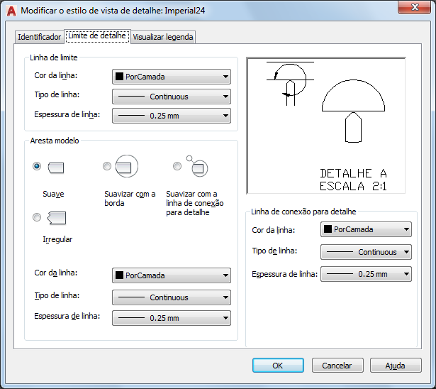 Define as propriedades da linha de fronteira, da aresta do modelo e da linha de conexão para detalhe de vistas de detalhe.