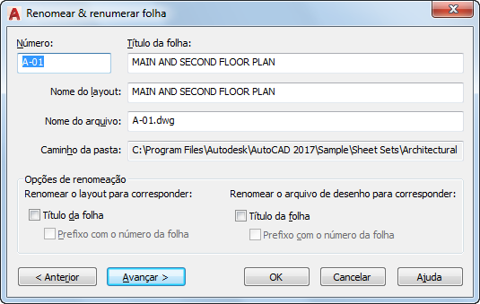 Quando selecionada, altera o nome do arquivo de desenho para um novo nome formado adicionando-se o número da folha ao começo do título da folha.