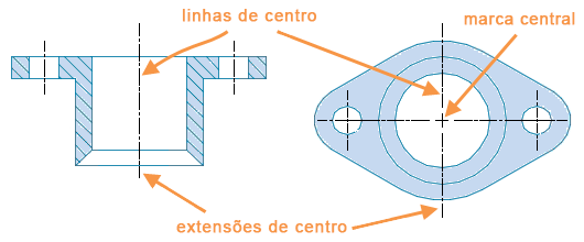 As marcas de centro e as linhas de centro são referências de cotagem para os centros dos furos e eixos de simetria.