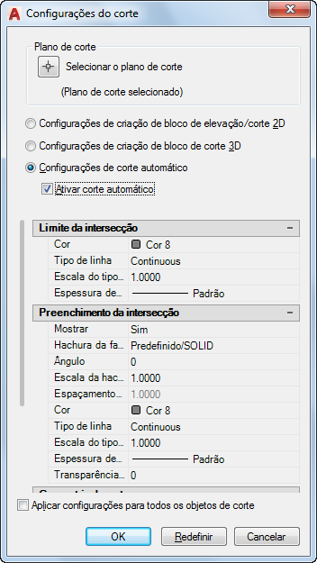 Contém configurações de exibição para a criação de cortes 2D e 3D a partir da caixa de diálogo Gerar Corte/Elevação e para corte automático. Todas as configurações são armazenadas com o objeto de corte.