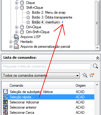No painel Lista de comandos, arraste o comando que desejar adicionar ao botão do mouse no painel Personalizações em